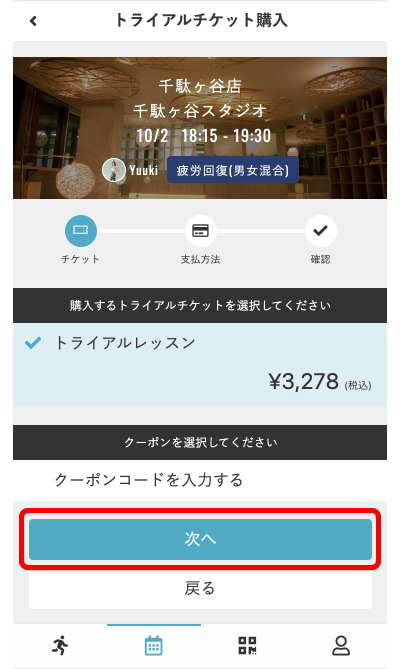 8.レッスン受講料をご確認の上、次へを選択 ※クーポンコードをお持ちの場合はクーポン欄にご入力ください。